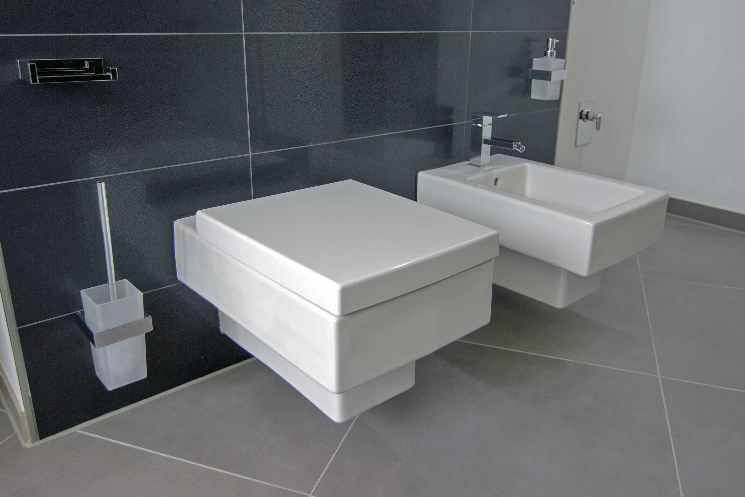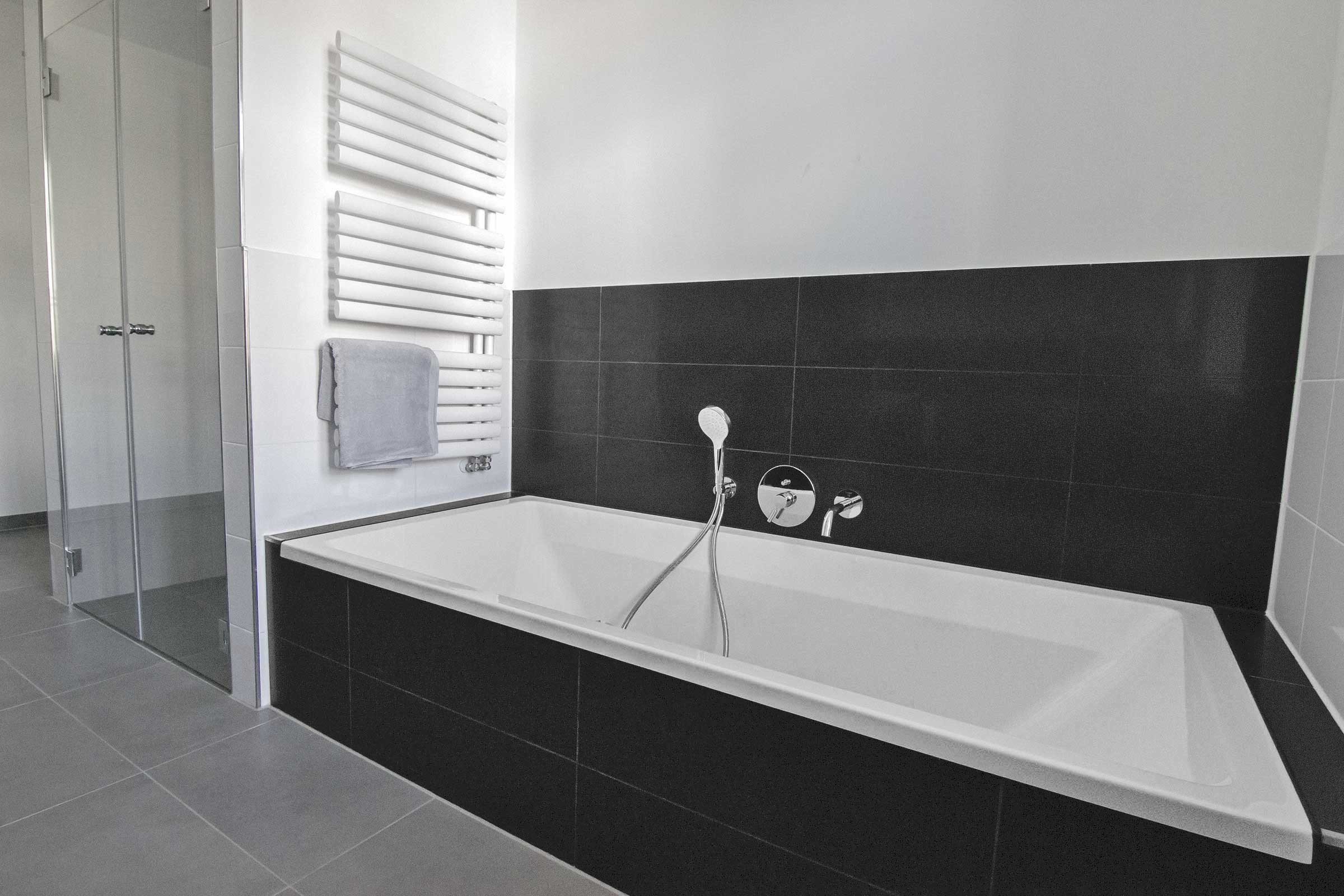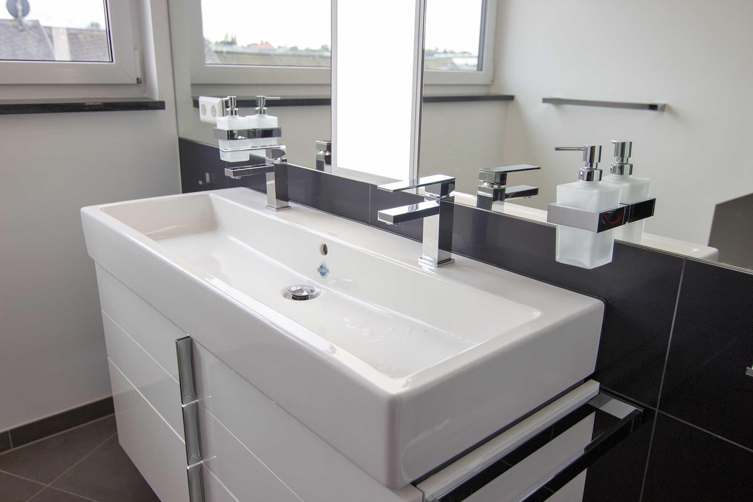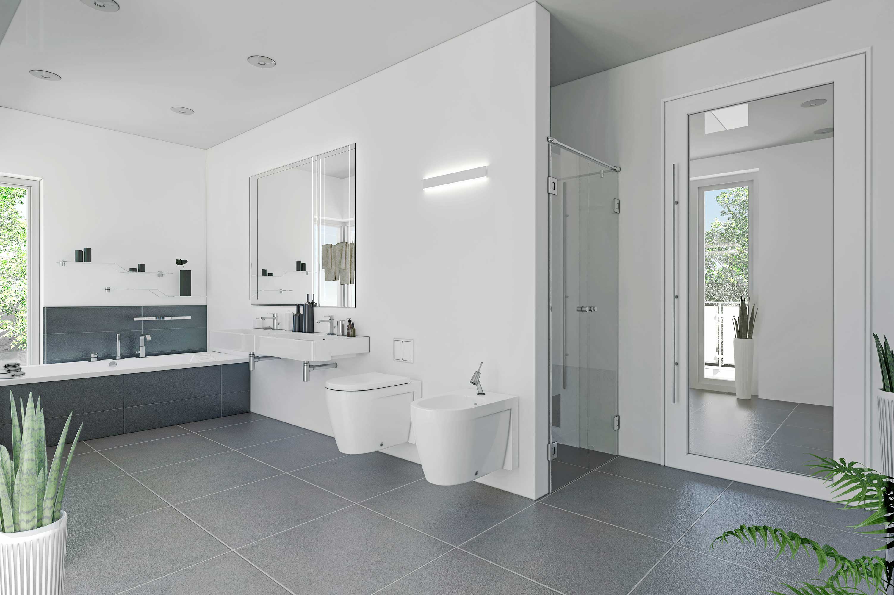Markenprodukte kombiniert mit modernen Materialien, hochwertige Keramik, geschmackvolle Armaturen und Accessoires sowie großformatige Feinsteinzeugfliesen stellen den hochwertigen Anspruch auf ein zeitgemäßes Wohnen auch in den Bädern unter Beweis.