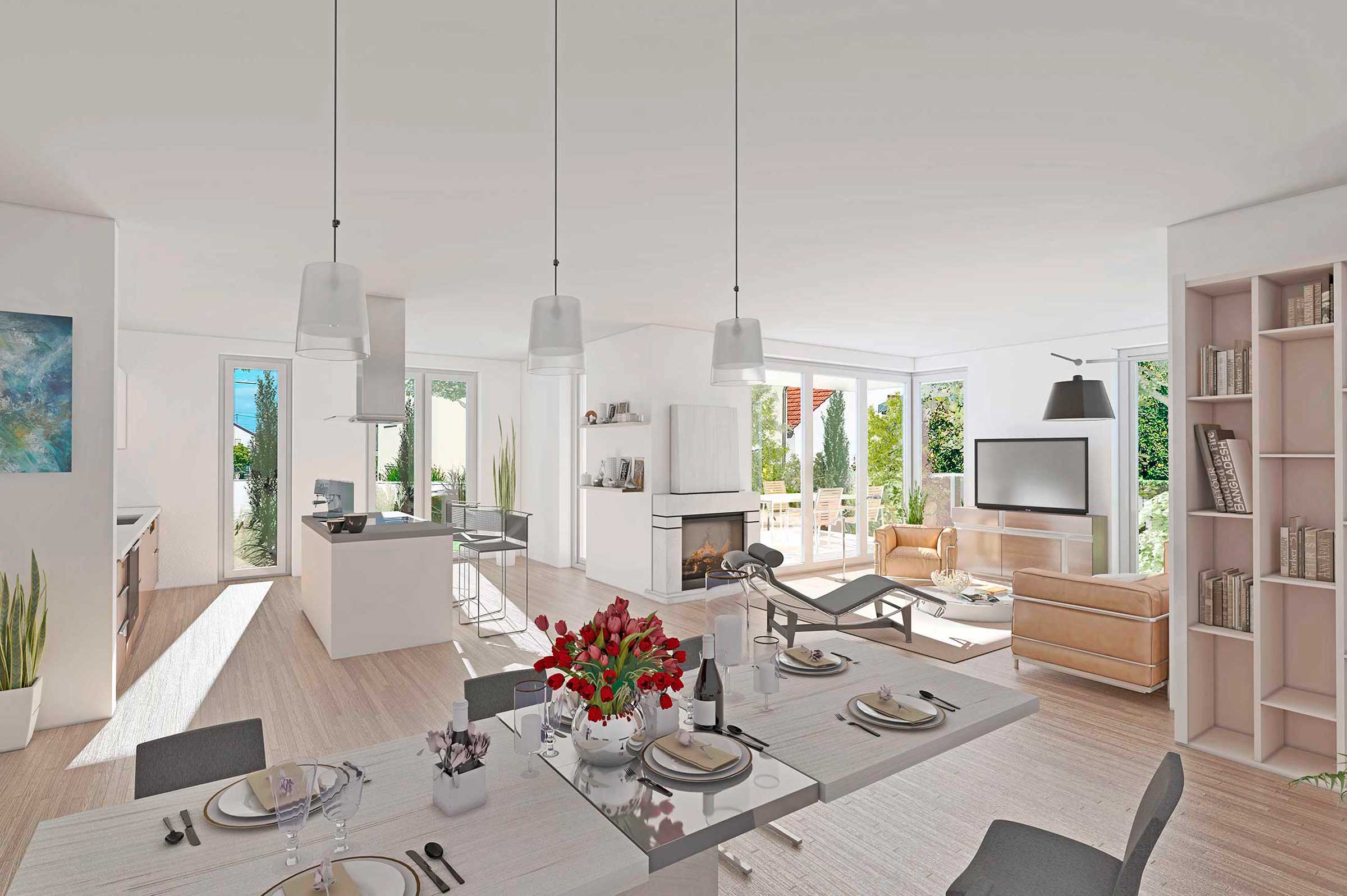 Die Wohnungen wurden so entworfen, dass sie im Einklang mit der Lichtsituation ein stimmiges Ganzes ergeben. Die offenen Wohn-, Koch- und Essbereiche als Herzstücke der Wohnungen überzeugen durch viel Licht und Lebendigkeit. Das Ergebnis sind helle, großzügige Lebensbereiche, die mit ihren Möglichkeiten zur flexiblen Möblierung und Nutzung überzeugen. Für dieses stilvolle und gemütliche Ambiente sorgen zudem das hochwertige Parkett / Feinsteinzeug mit Fußbodenheizung. Optional mit einem offenen Kamin für kuschelige Winterabende.